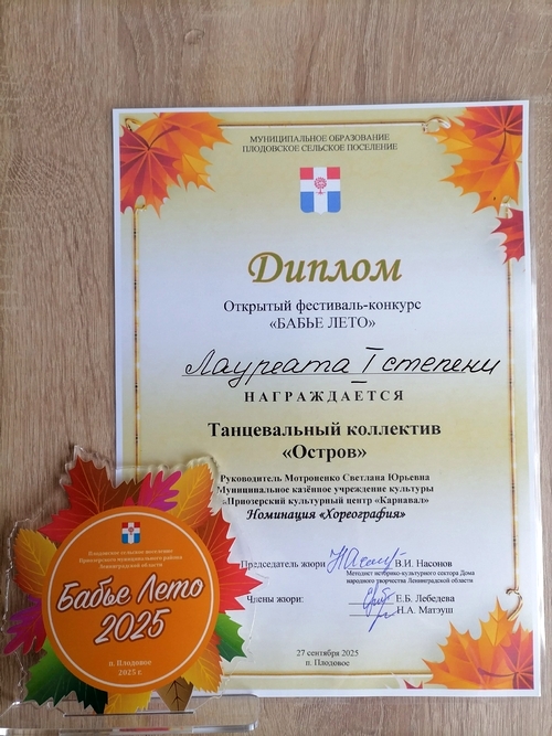 27 сентября в п. Плодовое прошёл открытый зональный фестиваль-конкурс "Бабье лето". Танцевальный коллектив "Остров" принял участие в конкурсе и был награжден Дипломом Лауреата I степени.
